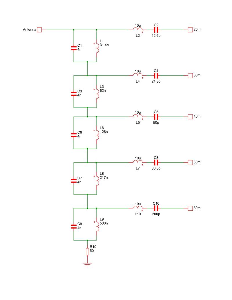 If this is OK, than remove the resistor from the bottom of the 20m circuit and connect the second circuit to the bottom of the first. Disconnect the third circuit and put the 50 ohm resistor at the bottom of the second circuit. Do the procedure again with 30m filter section. Keep the 50 ohm terminator on the 20 ohm section.