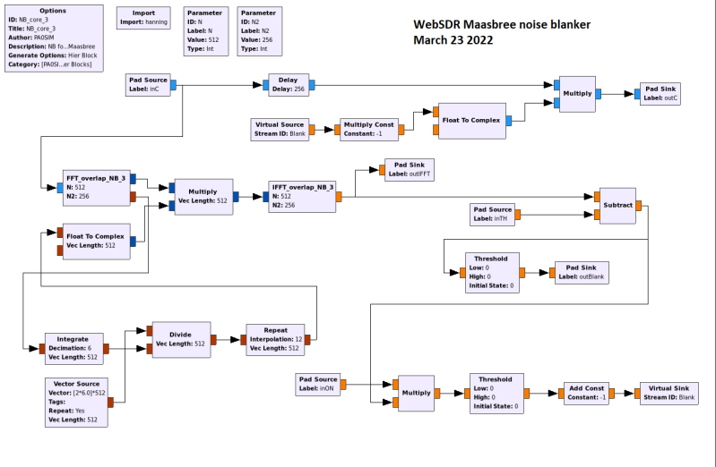The noise blanker is programmed in GNUradio companion and operates between the RSP1a driver and the websdr software.